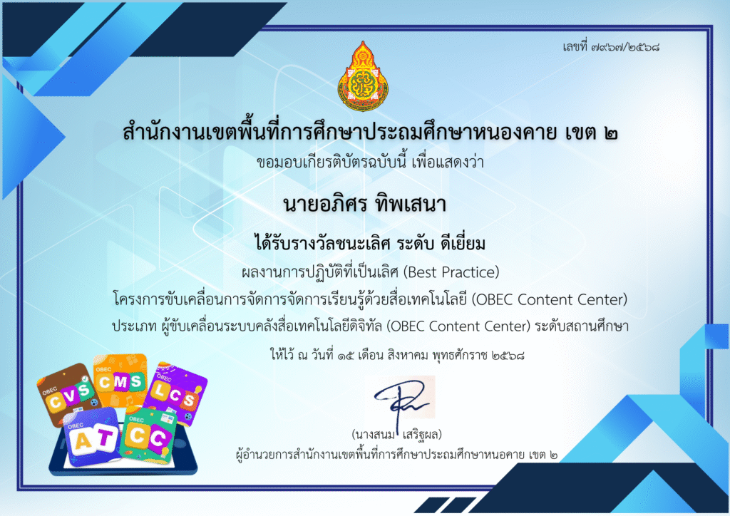 นายอภิศร ทิพเสนา ผู้อำนวยการโรงเรียนบ้านโนนสวรรค์ ได้รับรางวัลชนะเลิศระดับดีเยี่ยม ประเภทผู้ขับเคลื่อนระบบคลังสื่อเทคโนโลยีดิจิทัล สพป.หนองคาย เขต ๒ https://drive.google.com/file/d/1mvmlvToK1oeN8rDL9yahHy-EYKf4bI_n/view?usp=drive_link