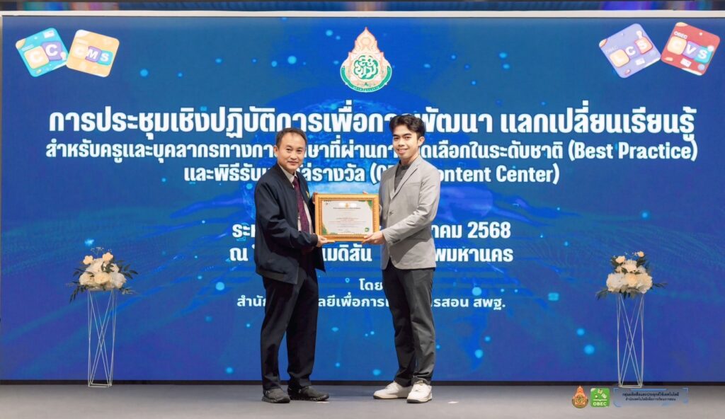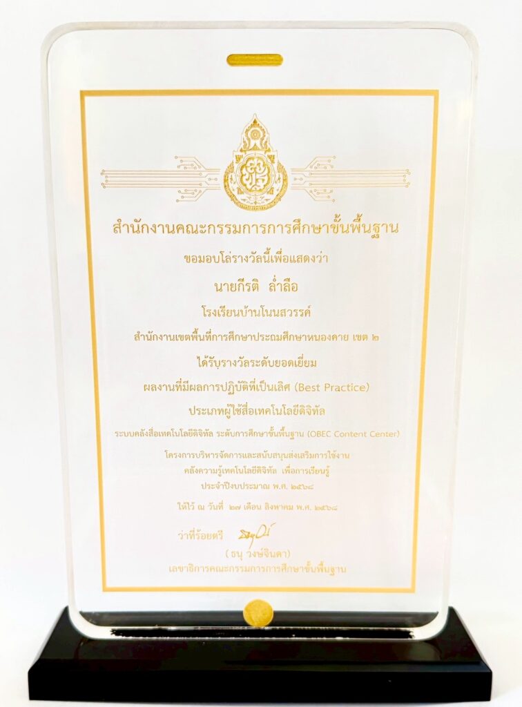ครูกีรติ ล่ำลือ รับโล่รางวัลระดับประเทศ ผู้ใช้สื่อเทคโนโลยีดิจิทัล (OBEC Content Center)