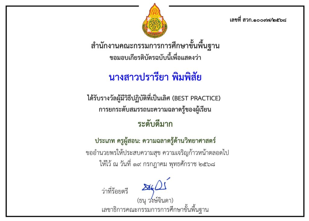 - นางสาวปรารียา พิมพิสัย ครูโรงเรียนบ้านโนนสวรรค์ ได้รับรางวัลผู้มีวิธีปฏิบัติที่เลิศ (Best Practice) การยกระดับสมรรถนะความฉลาดรู้ของผู้เรียน ระดับดีมาก ประเภทครูผู้สอน ความฉลาดรู้ด้านวิทยาศาสตร์
