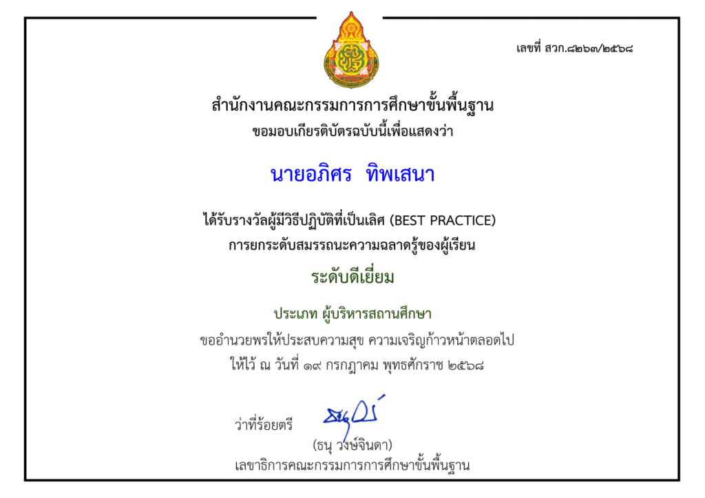 - นายอภิศร ทิพเสนา ผู้อำนวยการโรงเรียน ได้รับรางวัลผู้มีวิธีปฏิบัติที่เลิศ (Best Practice) การยกระดับสมรรถนะความฉลาดรู้ของผู้เรียน ระดับดีเยี่ยม ประเภทผู้บริหารสถานศึกษา